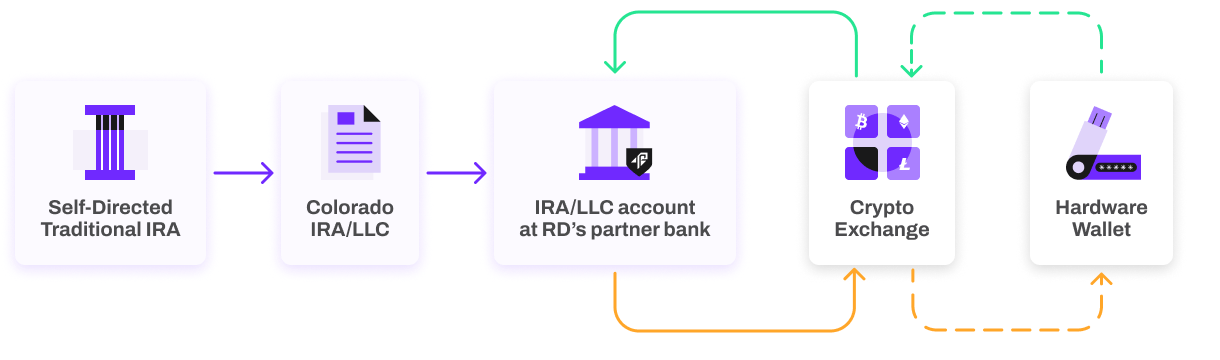 - When first investing, you must do so with fiat US retirement dollars in the name of your IRA LLC/Trust or Solo 401(k). These dollars can fund a centralized exchange account that allows private wallet withdrawals.