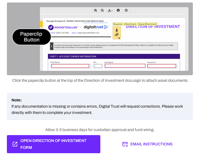 Step 8: Upon completion, the investment will be submitted for review. The Rocket Dollar and/or Digital Trust team will reach out if there are any issues. The investment will be displayed from the Rocket Dollar Dashboard once it has been approved and completed.
