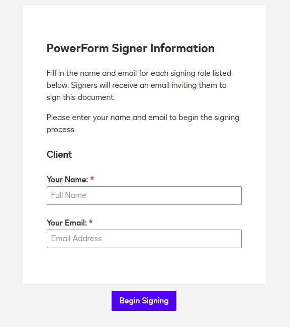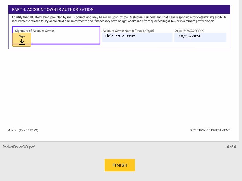 Step 4: Select to open the Direction of Investment form. This will lead you to a DocuSign where you must input your name and email address before continuing. Please be sure to use the email associated to your account.