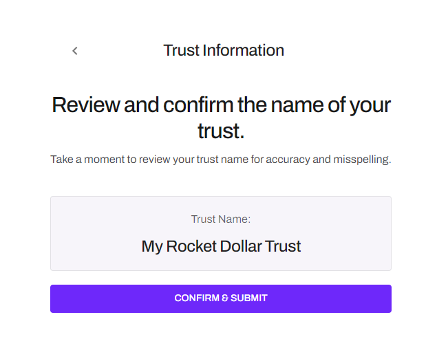 2. Confirm and submit the name of your Trust. If the Selected Trust name cannot be used, you will receive a response from our team.